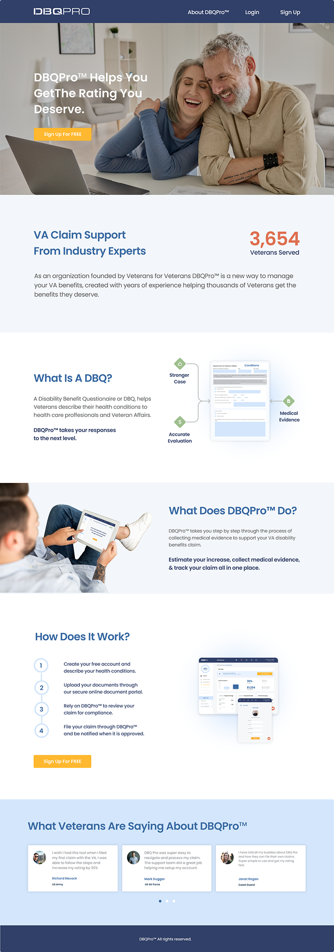 One of my main projects was to create a healthcare service SaaS platform, including DBQ Pro for disabled veterans and DBQ Doc for Veteran care providers. Learn More.